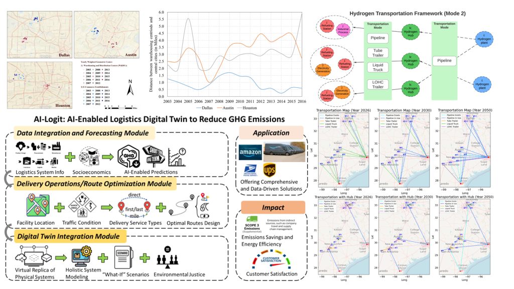 Dr. Wang’s group is advancing AI-enabled logistics and digital twin technologies to reduce greenhouse gas (GHG) emissions and improve supply chain efficiency. The AI-Logit framework integrates data-driven forecasting, delivery operations optimization, and digital twin modeling to support sustainable logistics decision-making.